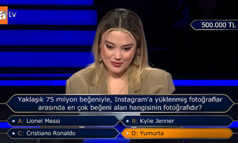 Türkiyədə yayımlanan “Kim milyoner olmak ister?” verilişində iştirakçının 500.000 TL-lik (19 min 705 AZN) suala “yumurta” cavabını verməsi sosial şəbəkələrdə müzakirələrə səbəb olub.