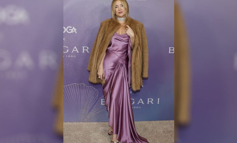 46 yaşlı Keyt Hadson dərin dekolteli lavanda rəngli libasda poza verib, çiyinlərinə isə yüngül kürk atıb. Görünüşü gümüşü sandaletlər, brilyant çoker və sırğalar tamamlayıb. Aktrisa saçlarını düz, makiyajını isə bənövşəyi göz kölgəsi ilə edib.